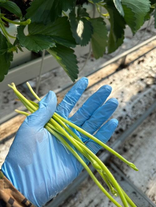 스마트팜 딸기 실습 교육 1주 차와 마찬가지로 2주 차에도 런너 정리를 했습니다. 런너는 수확까지 계속 나온다고 하니 시간 날 때마다 제거를 해주는 것이 좋습니다. 런너는 일주일만 정리를 안 해줘도 많이 쌓입니다.