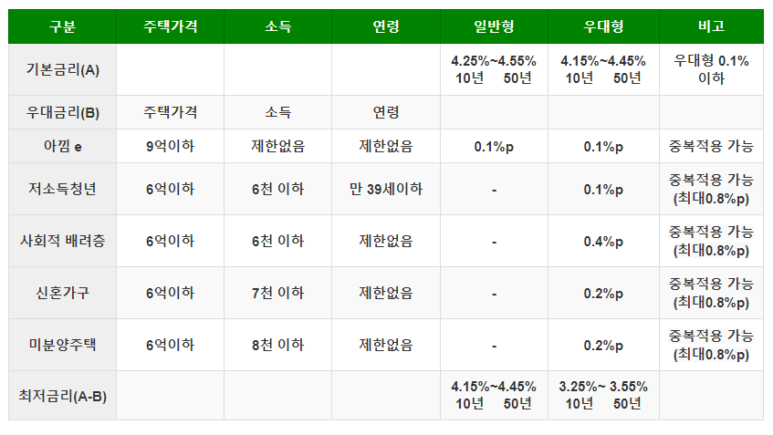 - 우대형 : 주택가격이 6억 원 이하 또는 소득이 1억 원 이하일 때 적용된다.